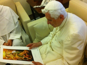 Benedetto XVI ammira il dipinto regalato da