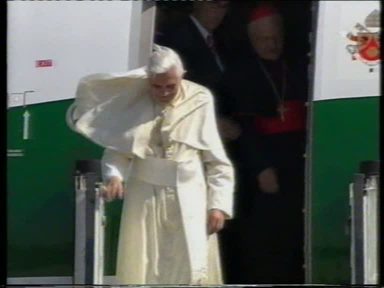 Köln 2005 #1. Benedetto XVI nel aeroporto di Köln/Bonn. Cappello bianco vola per la prima volta