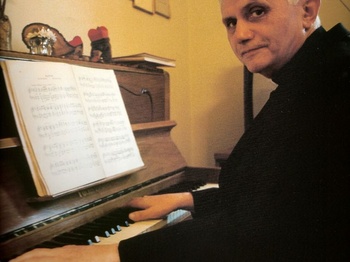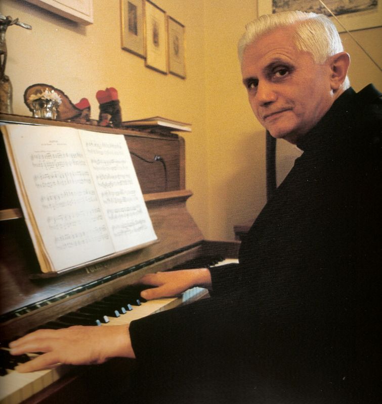 Ратцингер за фортепиано в служебной квартире на Citta Leonina дом №1. Этот инструмент переехал затем в его папские апартаменты. На верхней крышке можно обнаружить сувенирного котика в кардинальской биретте.