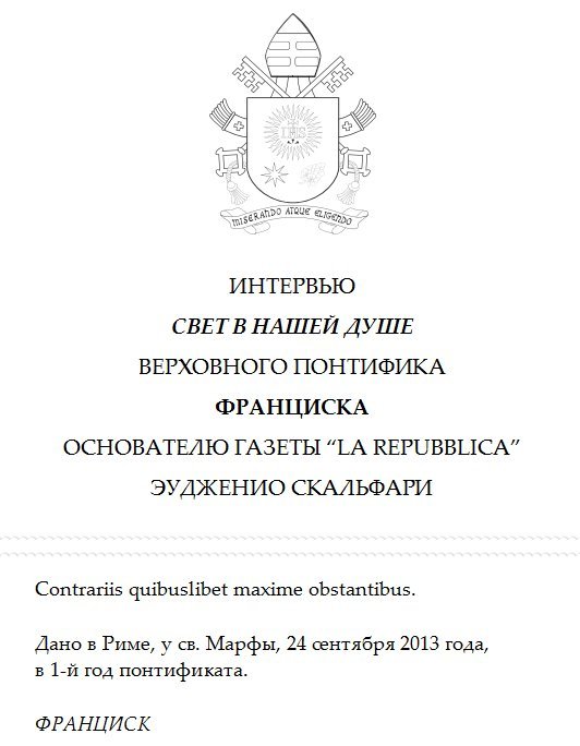 По своему содержанию интервью со Скальфари, которому предшествовало письмо Папы, опубликованное в «la Repubblica» 11 сентября, охватывает те же темы, что и интервью в «La Civiltà Cattolica», хотя и в более сжатой форме.
