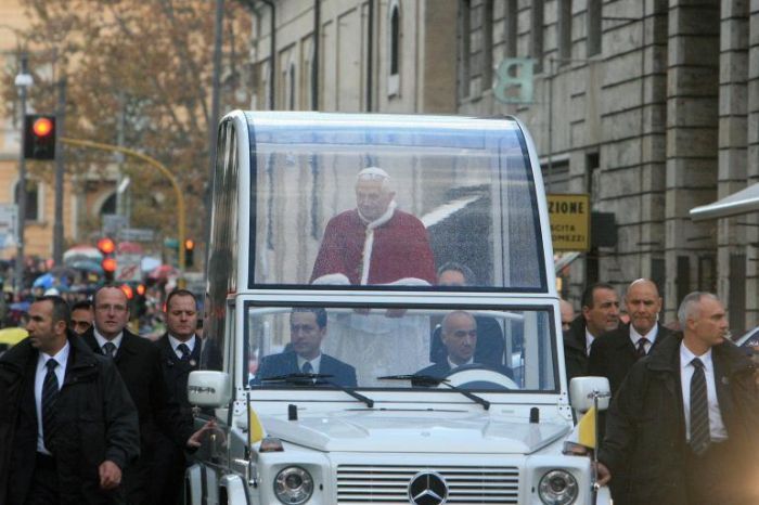 Кроме нескольких парадных "Гелендевагенов", новому понтифику в наследство от старого осталась "на каждый день" Lancia Jubileo - удлиненная версия модели Thesis. Машина также бронирована, ее пассажирский и водительский отсеки разделяет стеклянная перегородка. Крыша, изготовленная из углепластиковых панелей, раздвигается, и установленное в середине салона кресло с папским гербом выдвигается наверх с помощью электропривода - на этот случай также предусмотрен специальный бронированный стеклянный колпак.