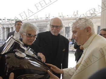 Уилли Джи Дэвидсон, который приходится внуком одному из родоначальников Harley-Davidson и его сын Билл принесли на встречу с Папой два бензобака для специального благословения. Бенедикт любезно жаловал благословение харлеям и обозначил обратный отсчет до 110-летия легендарного американского производителя мотоциклов, которое предстоит летом 2013 года.